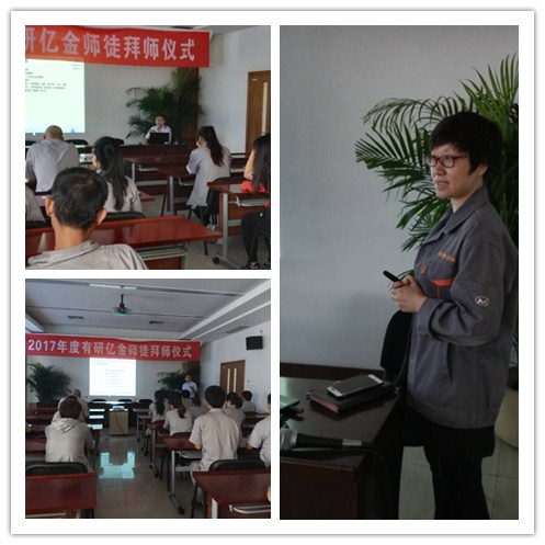 拜師儀式,呂總介紹了公司發展歷程,李總介紹了我司師徒制情況,各部門負責人介紹了本部門基本情況,通過這些介紹讓新員工們更加全面的了解了公司。之后新員工們依次做了自我介紹,新員工代表張曉娜進行了發言,她表示公司保留著傳統的傳承方式——師徒培養制度,讓初入職場的新員工多了一份責任感與歸屬感,以后定會愛崗敬業、虛心求教,不辜負領導和師傅們的期望。之后公司黨支部書記呂保國同志表示有研億金成立十七年來,秉承“創業、創新、發展、奉獻”的經營理念,已穩步快速發展為一家具備一定產業規模、在行業內具有良好影響力的高科技企業。今年年底,二期建設即將投入使用,未來的億金,將在各位的努力下,創造出更大的輝煌。最后公司總經理龐總表示熱烈歡迎大家加入有研億金,希望大家在今后努力工作,牢記有研億金核心價值觀“尊重、合作、創新、超越”。尊重—作為一個高科技企業,要尊重人才、尊重科學,發揮人才的主觀能動性。合作—在企業內部、企業與上下游合作伙伴在管理、業務、產業融合等方面深入廣泛的合作, 推動產業不斷向前。創新—積極推進企業觀念、管理和體制創新,促進企業科學發展,培育人才,創造價值。超越—成為微電子應用材料領域的技術引領者,實現產業跨越,經營跨越,不斷超越自身、超越對手,永續經營。我們要秉承著成為全球最具影響力的微電子用新材料及解決方案提供者的愿景,把握珍惜每一個機會,團結一致,眾志成城,共同創造有研億金美好的未來!